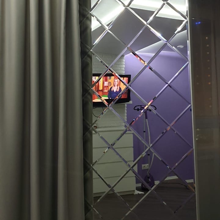 Зеркально панно было сделано из зеркальной плитки 30х30 см, размер панно 255х255 см